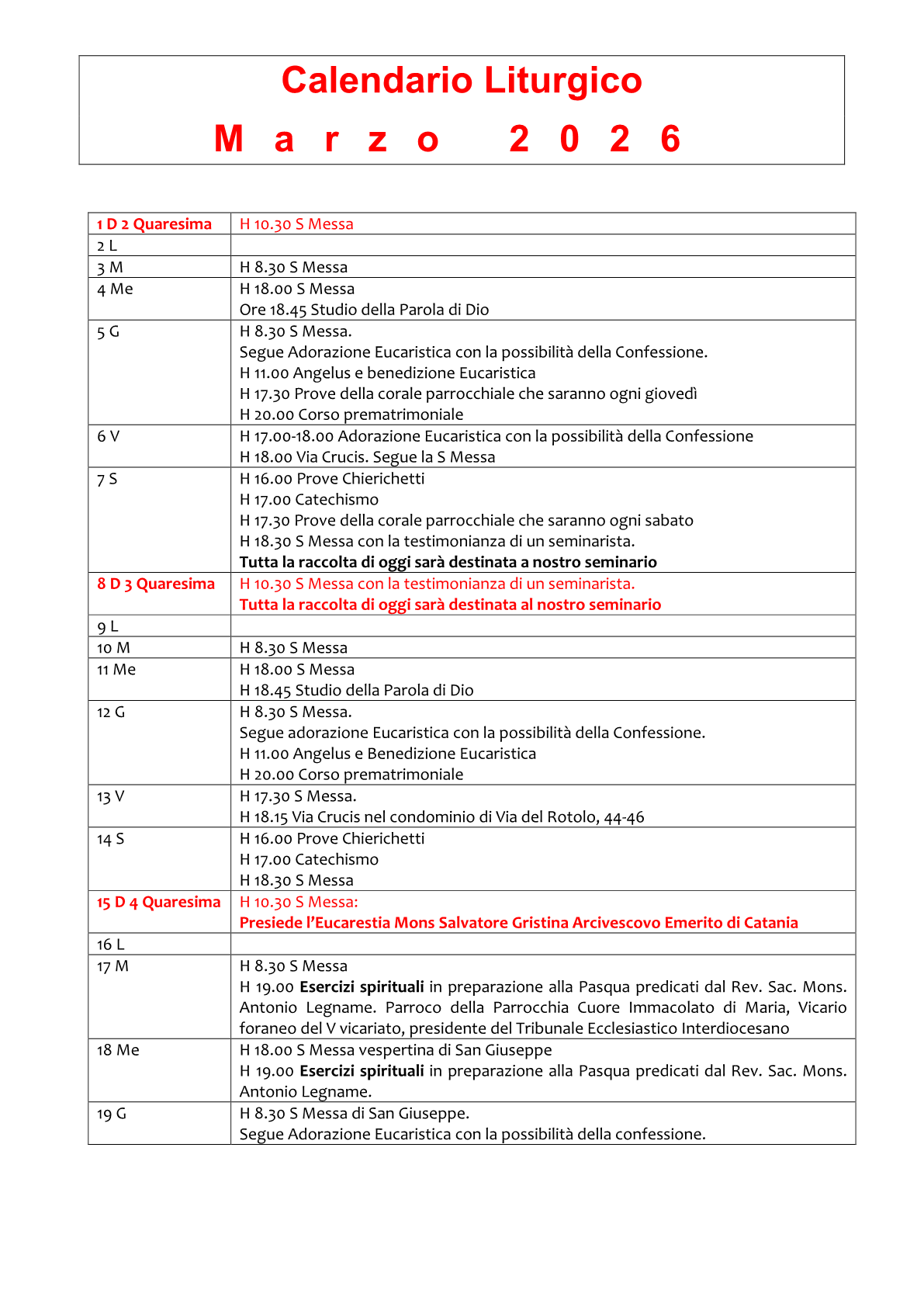 Martedì 17, Mercoledì 18, Giovedì 19 Marzo: H 19.00 Esercizi spirituali tenuti dal Rev.do Sac. Mons. Antonio Legname, parroco della parrocchia Cuore Immacolato di Maria, Vicario foraneo del V vicariato e Presidente del Tribunale Ecclesiastico Interdiocesano.