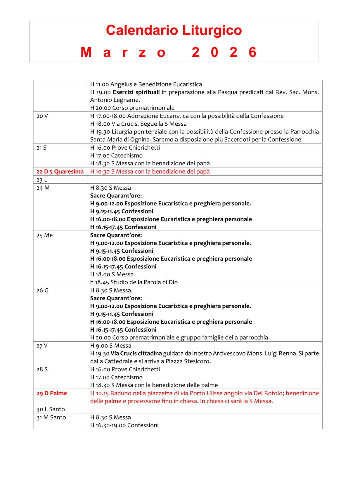 Martedì 24, Mercoledì 25, Giovedì 26 Marzo: Sacre Quarant’ore: H 9.00 – 12.00 Esposizione Eucaristica. H 9.15 – 11.45 Confessioni. – H 16.00 – 18.00 Esposizione Eucaristica. H 16.15 – 17.45 Confessioni